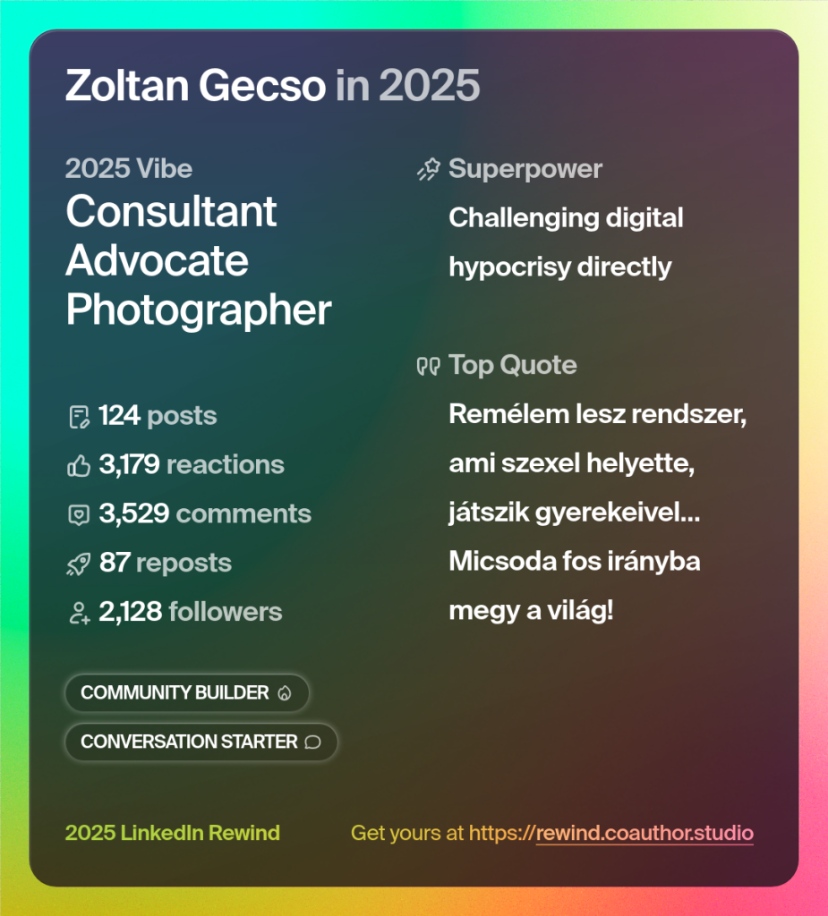 A számok reálisak, tényleg ilyesmi számok voltak a LinkedIn -en, pedig nem sok energiát ölök bele, nem használok „AI”-t, és nem veszem igénybe „közösségi média szakértő” segítségét sem. Én úgy gondolom, hogy csak időt töltök, „játszok” az oldalon, nincs vele semmilyen komoly célom. Nem akarok eladni semmit (na majd 2026-ban! 😀 ), sőt még magamat sem, így meg sem játszom magam, olyan vagyok a neten is, mint élőben. Még ha ez esetleg kiábrándítóan valóságos is így ebben a formában.